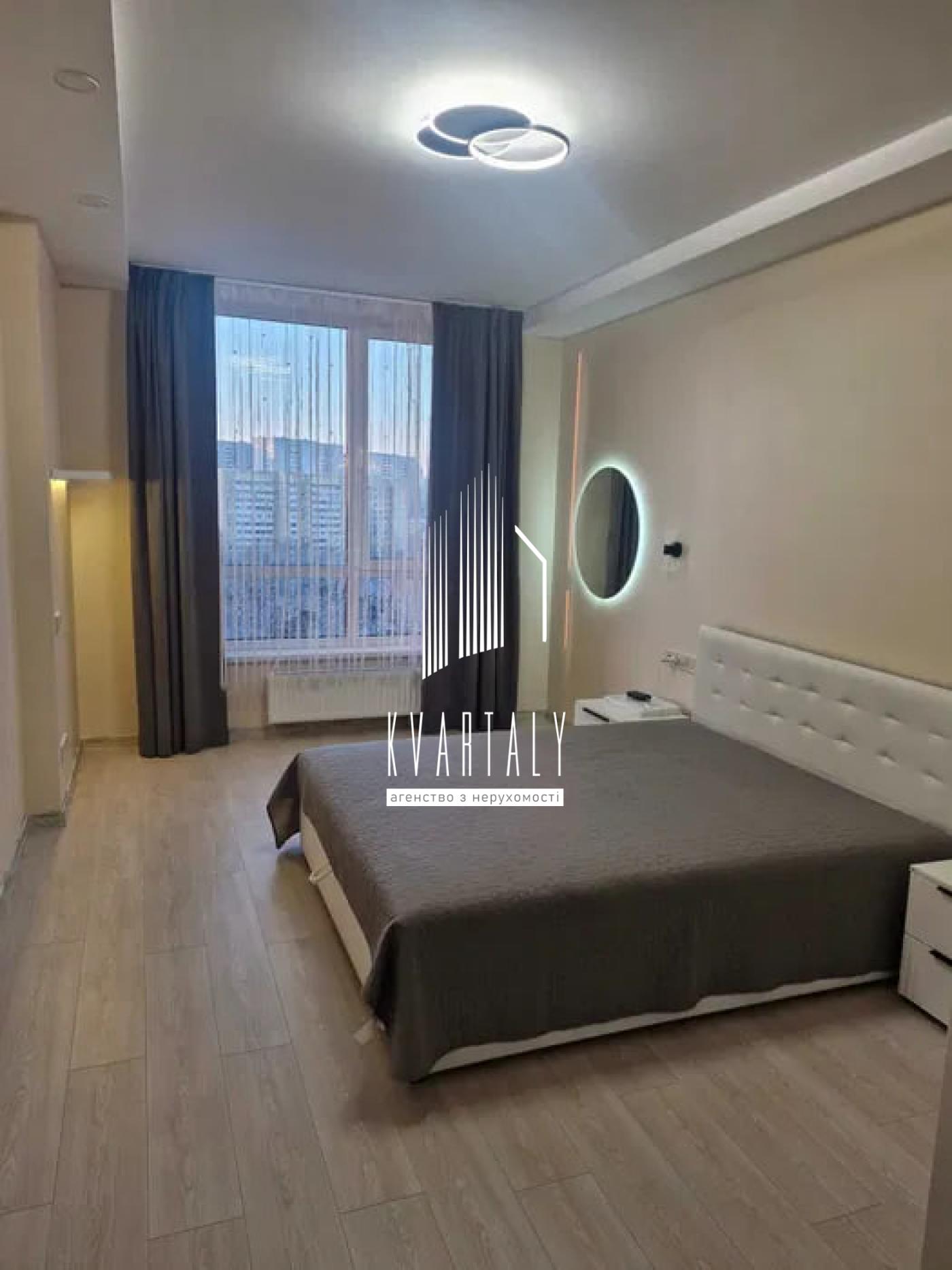 Двоспальне ліжко з ортопедичним матрацом з великою нішею, шафа-купе, зони для робочого місця та косметичного столика/тумби з підсвітками. Простора гардеробна. Щільні штори.
